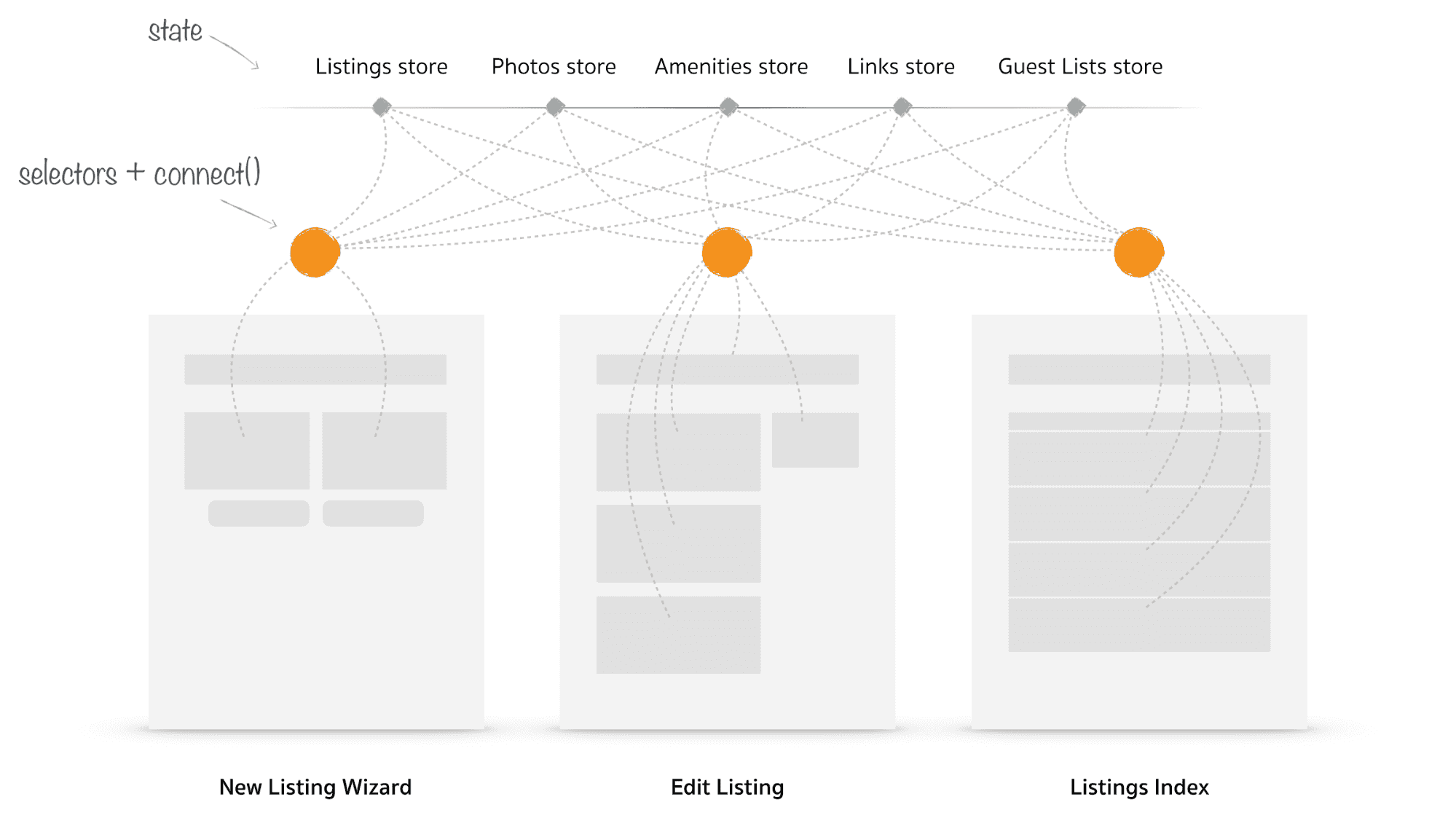 Similar pattern was used to implement Listings UI, but using Redux. We had a number of stores like listingsStore, photosStore etc. (To clarify: we have one redux store, but we call slices of the state, that are being transformed by reducers, each a store). Every store contained entities, form state for each entity, statuses (e.g. isProcessing) etc. From the store, data is combined via selectors and passed down to components — right from the top of the render tree. Like this: