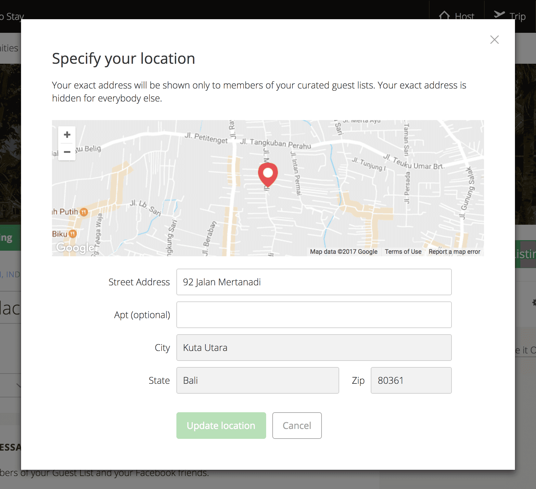 Let’s take a look at the example. In Listing Edit Screen host can edit the location of his property: he clicks on the address line and a modal with the form shows up: