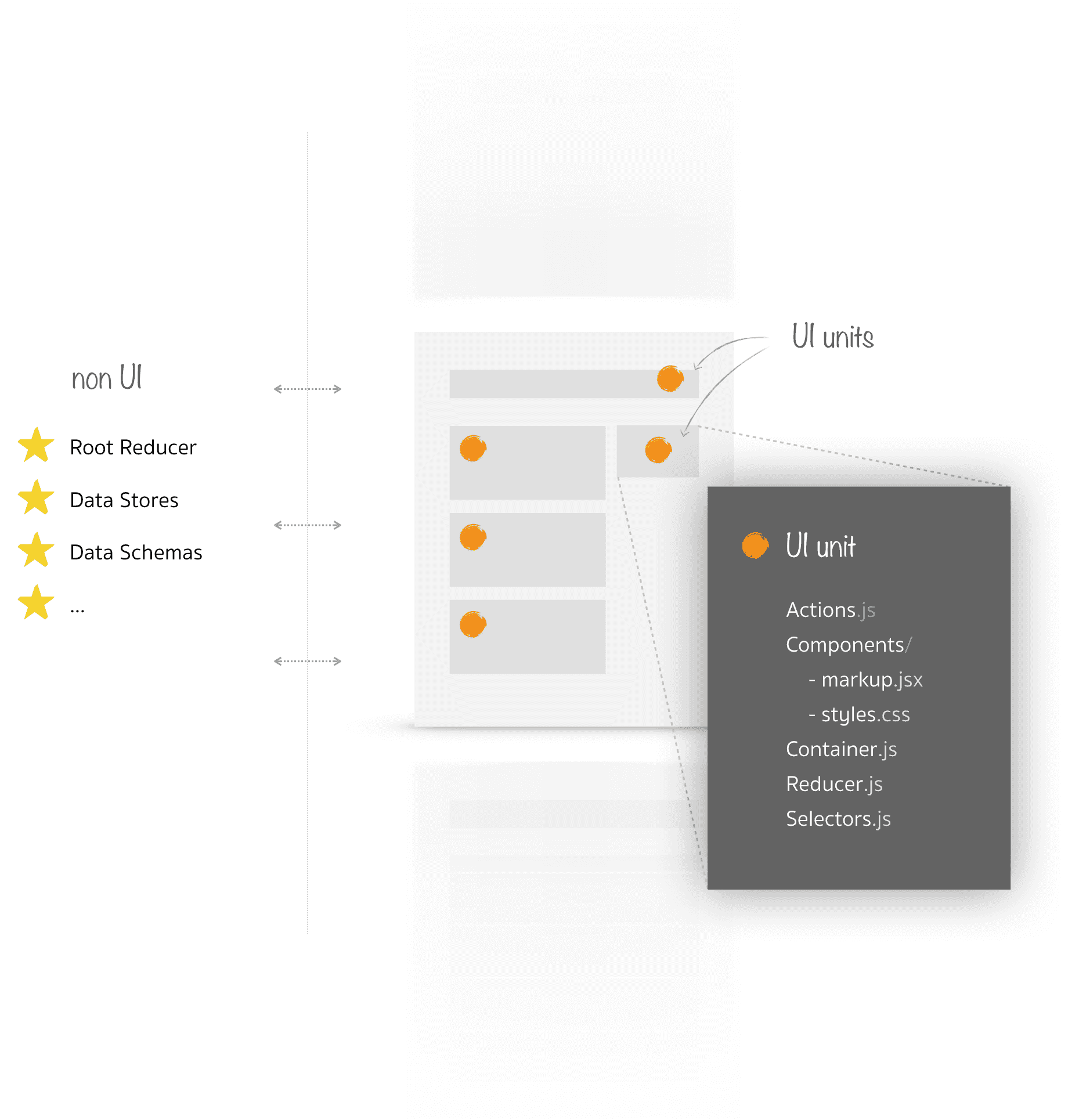 UI unit is only element of the user interface, like a modal, or a widget, or a form. In the project tree it encapsulates all its related parts inside a single folder. UI units can be nested, but they are not coupled to each other (thanks to Redux). You can move them around like blocks. Easy to manage, easy to remove, and easy to reason about. Every time you work with the UI element, it’s like focus mode: you’re always in the context of what you’re doing and everything you need — right here at your fingertips.