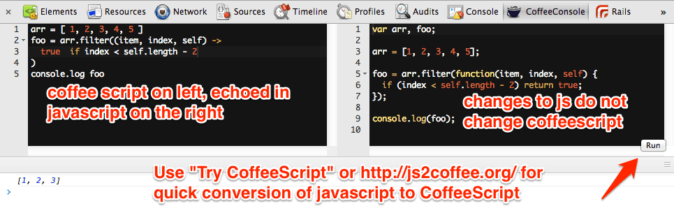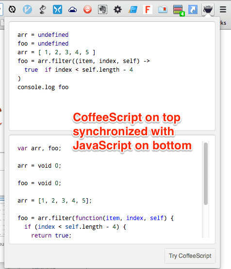 Try CoffeeScript Chrome Extension: Converting between CoffeeScript and JavaScript