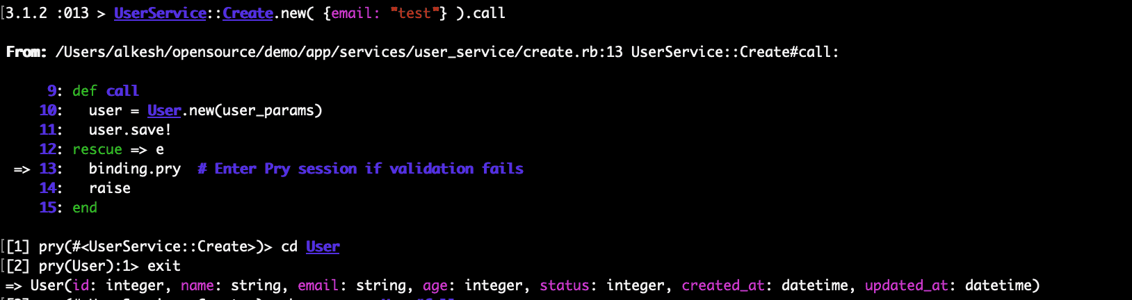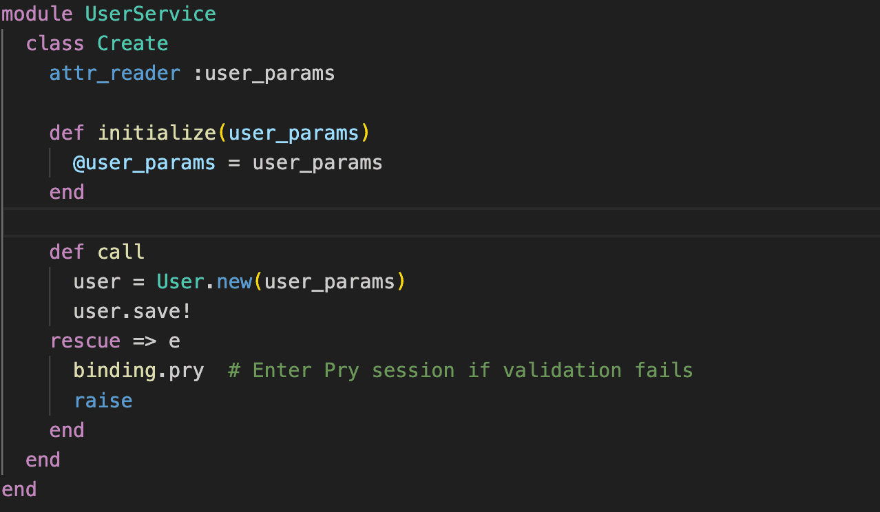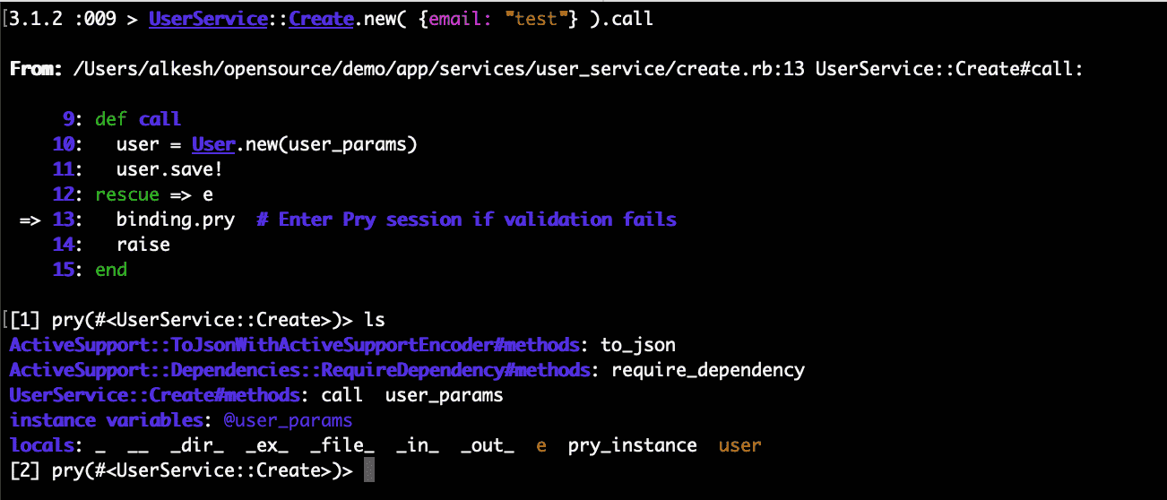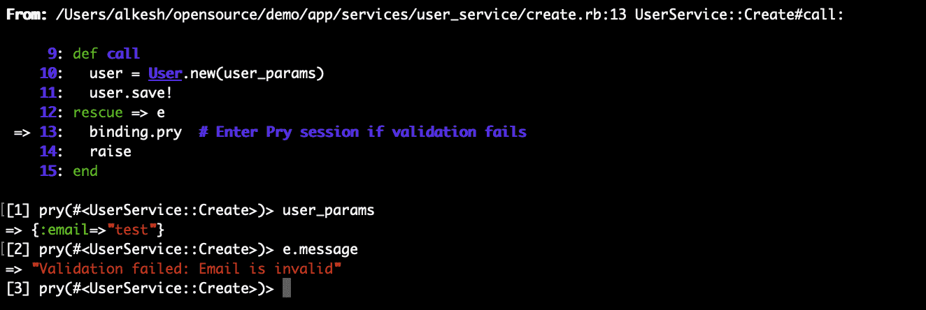 When you execute the service, the code gets stuck at the binding.pry line. You can verify the user parameters and the exceptions raised when creating a user.
