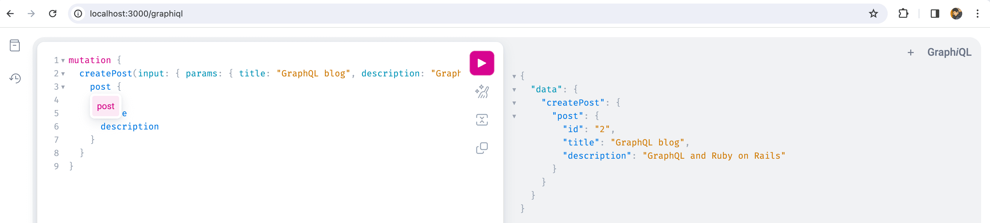 createPost(input: { params: { title: "GraphQL blog", description: "GraphQL and Ruby on Rails" }}) {