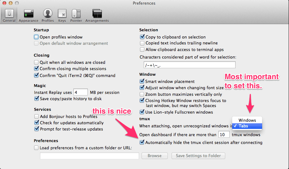 - Configure your Tmux to open tabs rather than windows. This is key to getting the iTerm2 version to look like your original tmux session.
