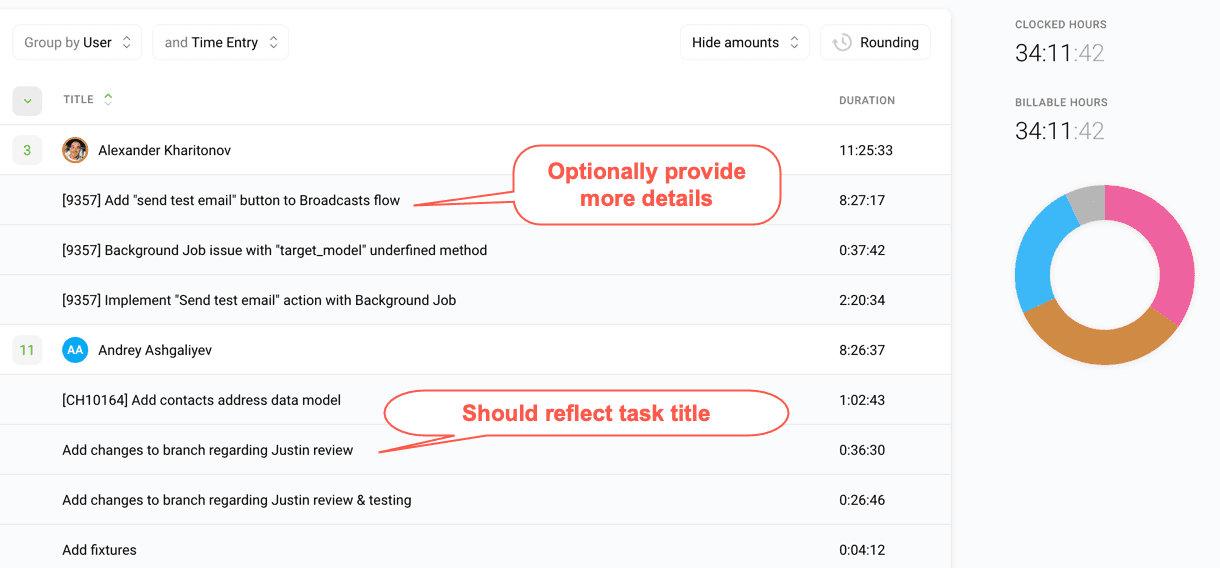 My number one goal as CEO of ShakaCode is that my clients are satisfied to the point they are referenceable. Since the majority of our projects are billed per hour, clear and regular communications regarding time spent on various tasks are critical to having good client relationships. Every week, I send my team and clients 3 reports that show various breakdowns that detail how time was spent. With these reports, our clients can assess the overall level of effort for various tasks and efficiency of ShakaCode development efforts. Beyond just tracking time to a task, we try to break the work up behind a task into more detailed "time entries" that can provide color to what was done.