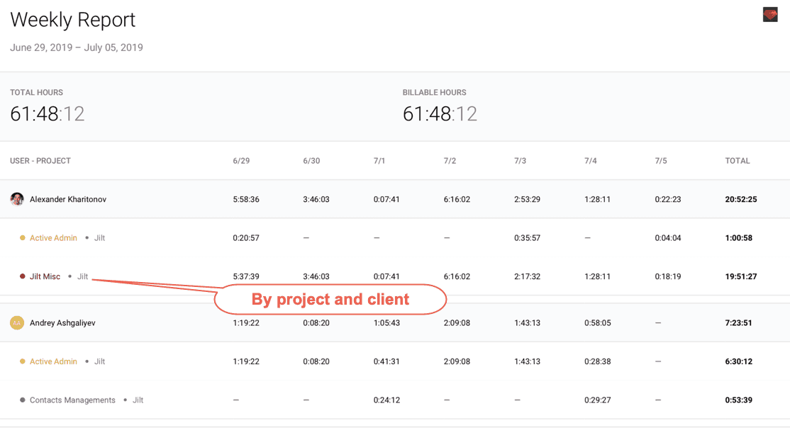 - Weekly Report Grid - Shows the day of the week across columns and the users on rows, with breakdowns by project, which provides high-level details on what a developer did for each of the past 7 days.