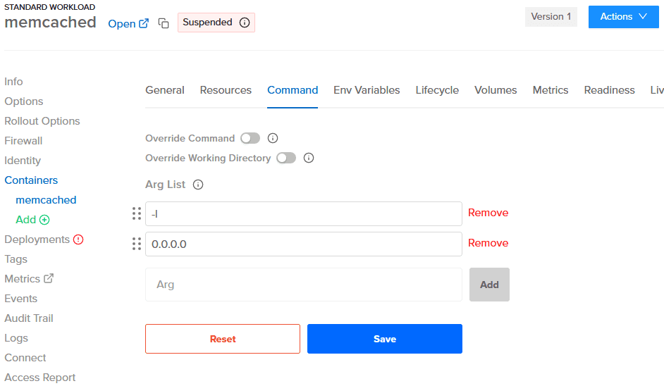 On the workload container for Memcached (using the memcached:alpine image), configure the command with the args