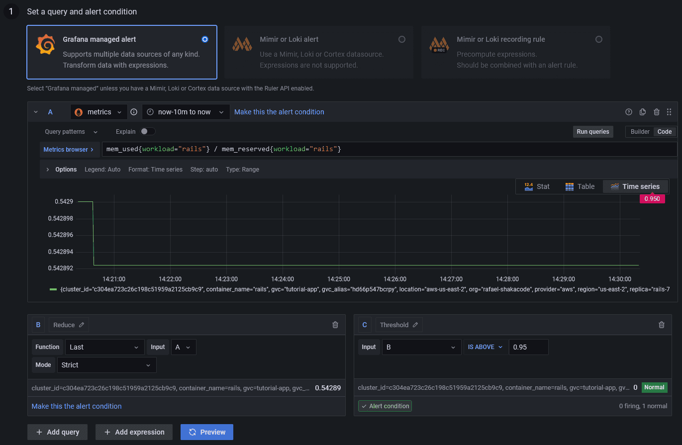 C, with the typeThreshold, and the inputB(this is where you configure the condition for firing the alert, e.g.,IS ABOVE 95) - You can then preview the alert and check if it's firing or not based on the example time range of the query